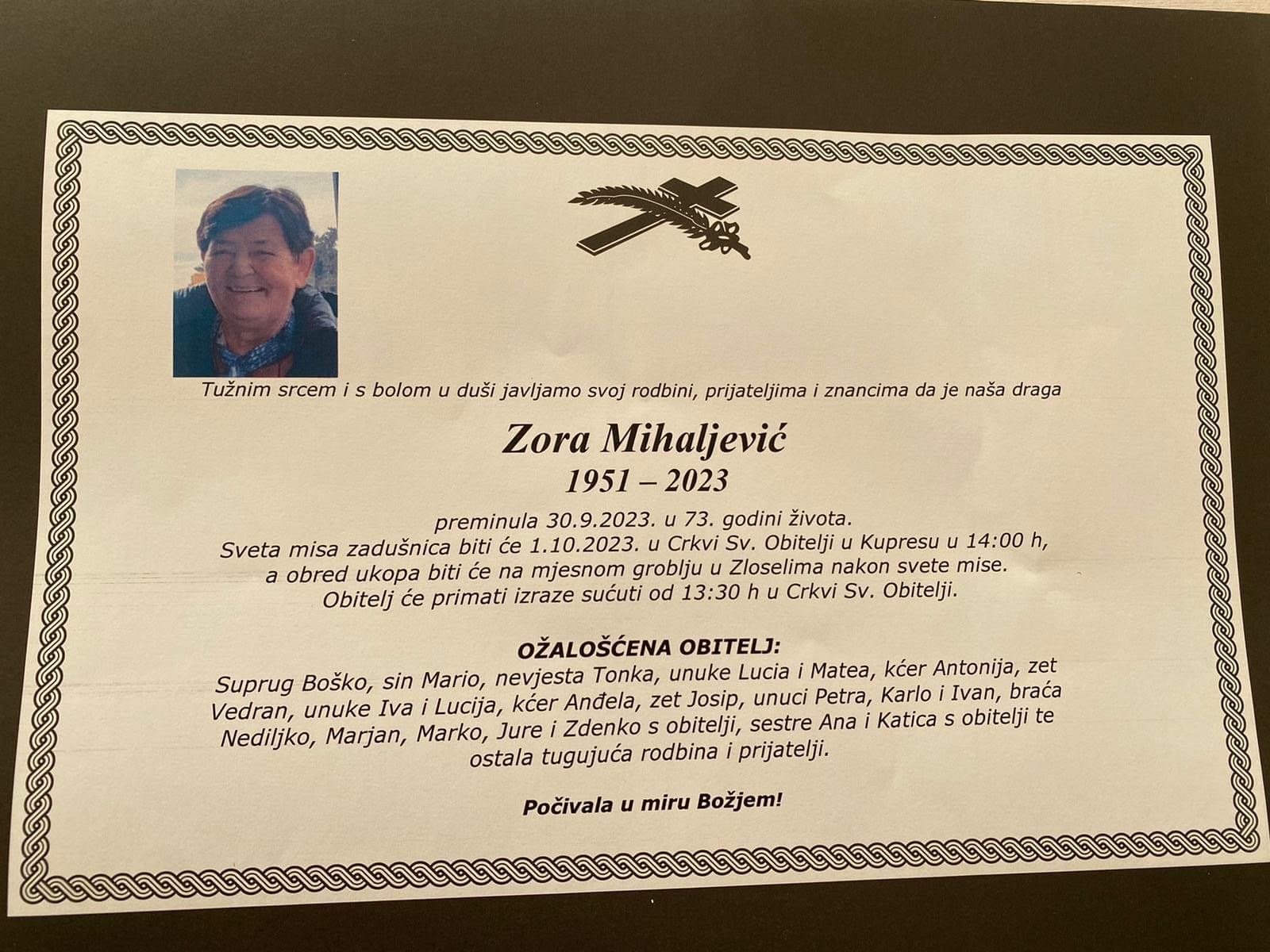 ZORA MIHALJEVIĆ (1951-2023) Sveta Misa zadušnica za pokojnu Zoru bit će sutra, 01.10. 2023. godine...