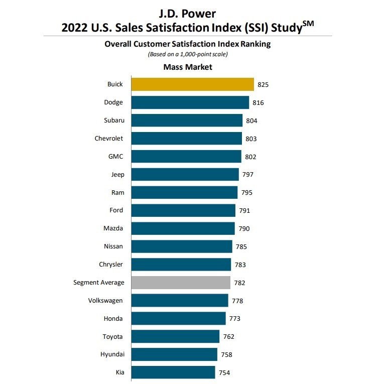 Punim imenom 2022 U.S. Sales Satisfaction Index (SSI), studija analizira iskustvo kupca pri kupovini automobila, njegovim iskustvom kupovine u zastupstvu i odnosu marke prema njemu kao kupcu. Šest je osnovnih čimbenika, i to proces isporuke (26 posto), osoblje zastupnika (24 posto), proces kupovine (19 posto), kompletiranje dokumentacije (18% posto), infrastruktura zastupnika (10 posto) te internet stranica zastupnika (4 posto).