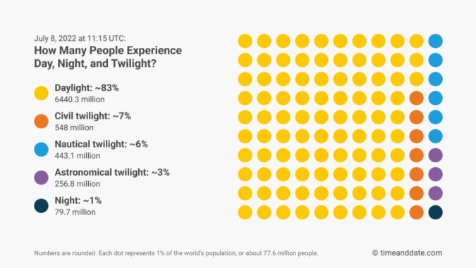 Kombinirajući podatke o suncu Time and Datea s podacima o stanovništvu 2022. iz Centra za međunarodnu informacijsku mrežu znanosti o Zemlji na Sveučilištu Columbia, otkriveno je da je u 11 i 15 8. srpnja noć bila za nešto manje od 80 milijuna ljudi na svijetu.