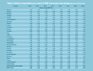Prosjek za čitav NATO savez je 2,65 %, ali bez Amerike prosjek svih europskih saveznika i Kanade je 1,69 %. – 2021. je bila sedma uzastopna godina rasta ulaganja u obranu među europskim saveznicima i u Kanadi – rekao je glavni tajnik NATO-a Jens Stoltenberg. Svi će saveznici u sljedećih par mjeseci poslati u sjedište saveza dodatne planove o tome kako planiraju doseći ciljeve povećanja svojih proračuna za obranu. Njemačka, čija su ulaganja u obranu 2021. bila na razini 1,49 posto njemačkog BDP-a, očekuje veliki skok nakon što je kancelar Olaf Scholz najavio osnivanje fonda sa 100 milijardi eura za dodatna ulaganja u vojsku. Obrambeni proračun Njemačke u 2021. je iznosio 53 milijarde eura.