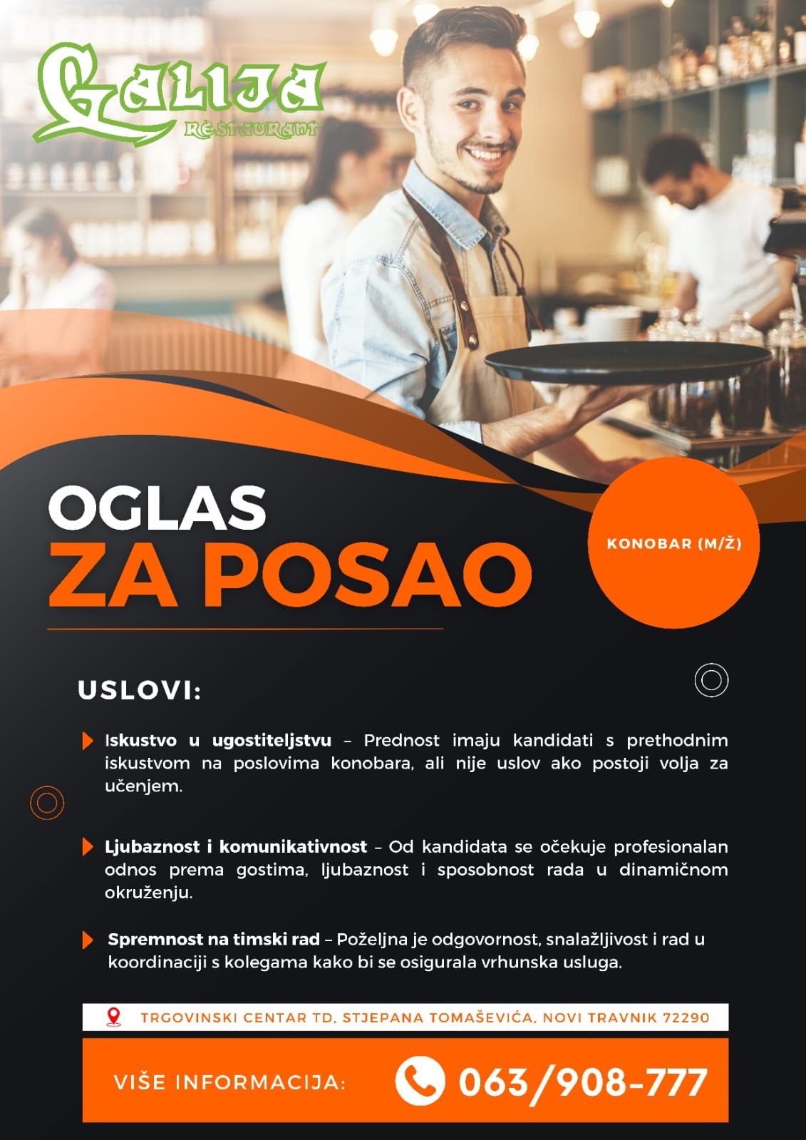 Restoran Galija traži pojačanje: Pridruži se našem timu kao konobar/ica! Restoran Galija iz Novog Travnika...