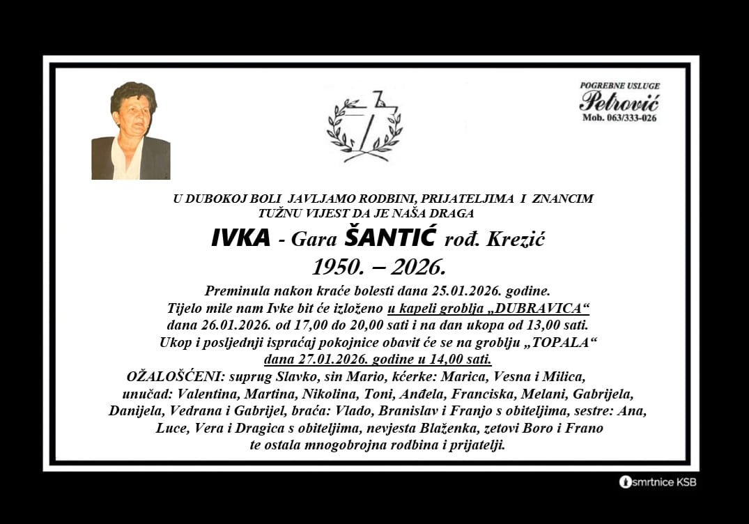 S vjerom u uskrsnuće i život vječni javljamo tužnu vijest da je Ivka Šantić, rođena...