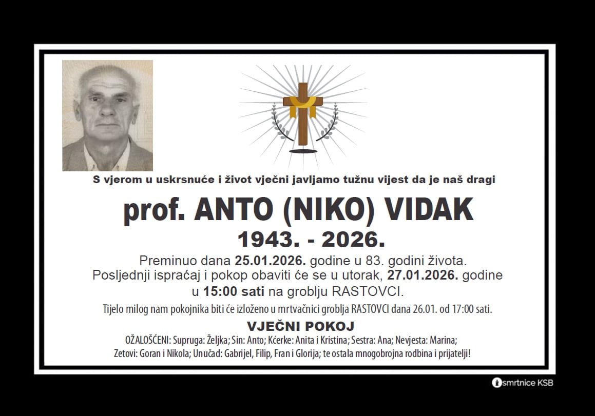 S vjerom u uskrsnuće i život vječni javljamo tužnu vijest da je Anto (Niko) Vidak...