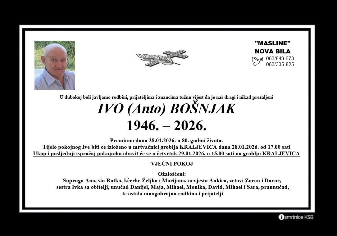 Tužna srca obavještavamo rodbinu, prijatelje i poznanike da je u 80. godini života preminuo Ivo...