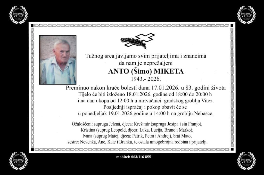 U 83. godini života, nakon kraće bolesti, preminuo je Anto (Šimo) Miketa, dugogodišnji stanovnik Viteza....