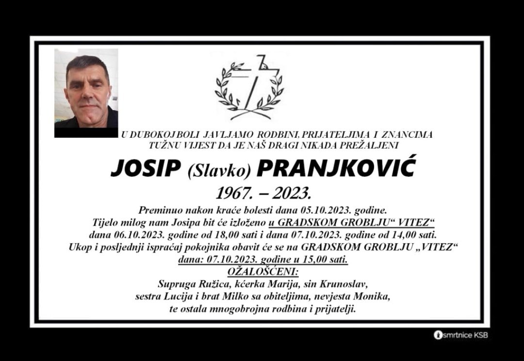 Preminuo Josip (Slavko) Pranjković iz Viteza u 56. godini života. Posljednji ispraćaj i ukop obaviti...