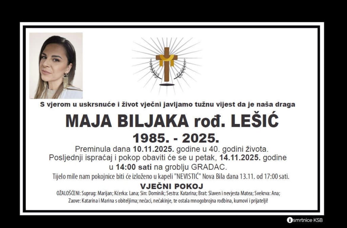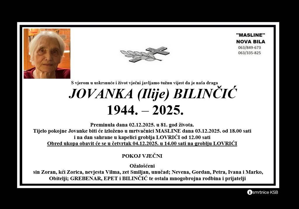 Jovanka (Ilije) Bilinčić iz Nove Bile preminula je 2. prosinca 2025. godine u 81. godini...