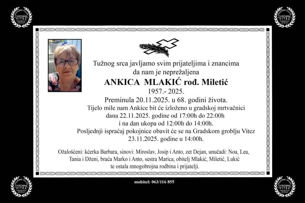 U 68. godini života preminula je Ankica Mlakić, rođ. Miletić, 20. studenog 2025. godine. Tijelo...