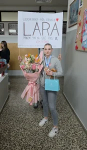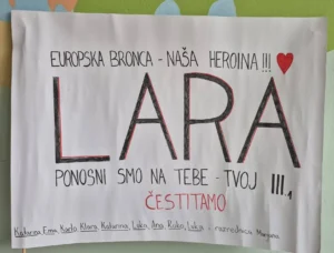 Dolazak mlade sportašice ispraćen je gromoglasnim pljeskom i ovacijama koje su ispunile školu. Trenuci iskrene radosti i podrške izazvali su emocije ne samo kod Lare, već i kod mnogih prisutnih. Ravnateljica je u ime škole učenici uručila prigodan poklon i buket te joj čestitala na osvojenoj medalji, nakon čega se slavlje nastavilo u učionici.