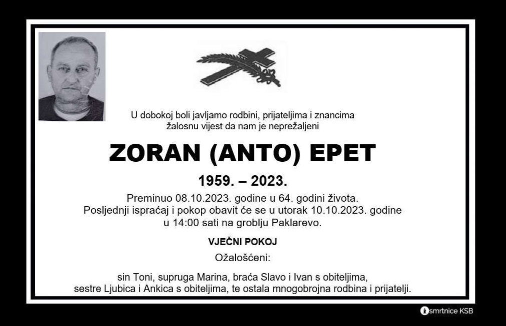 Preminuo Zoran Epet iz Travnika u 64. godini života.