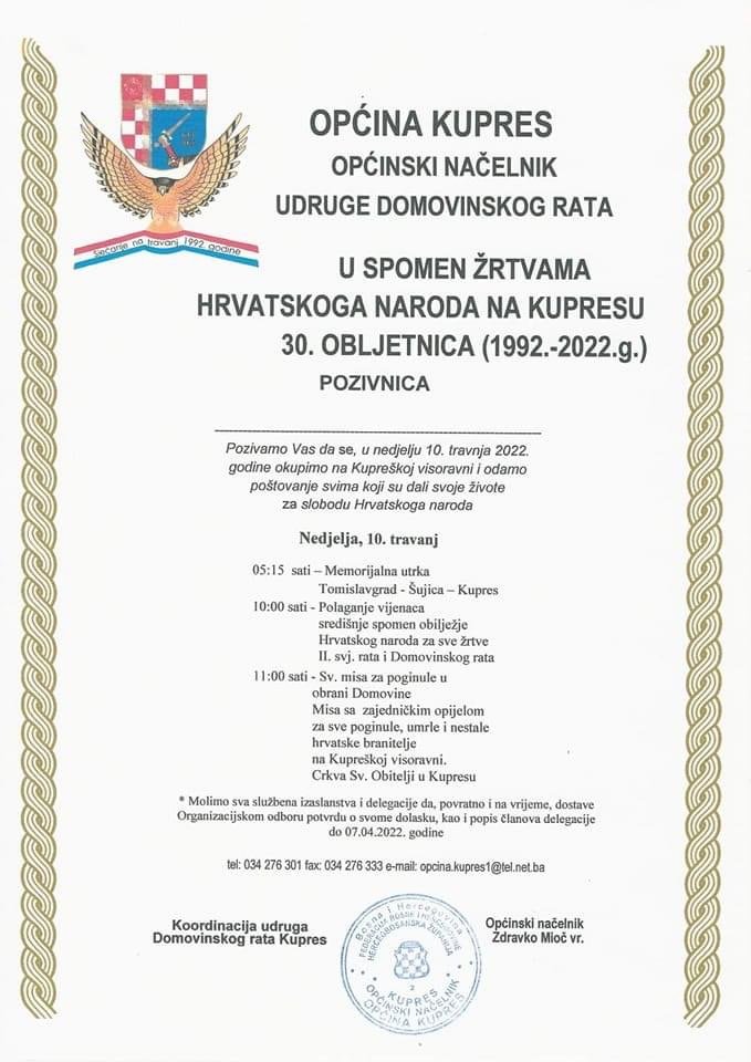 Općina Kupres, Općinski načelnik i Udruge proistekle oz Domovinskog rata pozivaju sve da se 10....