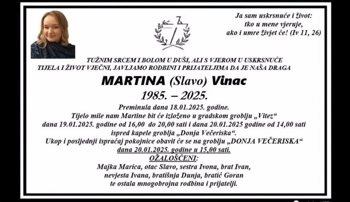S tugom u srcu obavještavamo javnost da nas je 18. siječnja 2025. godine napustila Martina Vinac. Posljednji ispraćaj drage Martine održat će se 20. siječnja 2025. godine u 15:00 sati na groblju “Donja Večeriska”. Tijelo pokojnice bit će izloženo na gradskom groblju “Vitez” 19. siječnja od 16:00 do 20:00 sati te 20. siječnja od 14:00 sati ispred kapele groblja “Donja Večeriska”.