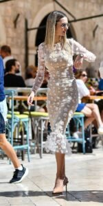 Prva dama Stradunom je prošetala u uskoj haljini midi dužine s volanom na donjem rubu. Uska haljina dugh rukava ima bež podstavu koja se nazire ispod bijelog materijala s 3D cvjetovima.