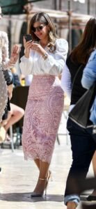 Druga dama nosila je kombinaciju saastavljenu od bijele bluze i čipkaste uske midi suknje u nježnoj nijansi ružičaste boje.